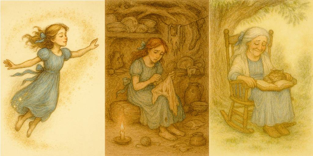 Der Name Wendy war schon seit ich klein bin ein Traumname. Ich wollte sein wie Wendy, hinfortgetragen von einem Fabelwesen in eine Welt voller Freiheit und Gemeinschaft. Vor Kurzem habe ich das Originalbuch gelesen und bin geschockt. Die Figur des Peters ist unachtsam, mörderisch, undurchsichtig und sehr unterdrückend. Ich sehe Wendy jetzt als ein Kind, dass aus dem sicheren Zuhause in eine Welt voller Gewalt und Verwirrung geholt wurde. Sie wollte Abenteuer und musste mit Haushaltsaufgaben und einer Mutterrolle, für die sie noch viel zu jung war, bezahlen. (Das kenne ich aus meiner Kindheit.) Doch irgendwann konnte sie zurückkehren und sich selbst wieder finden. Der Reiz der alten Muster ist verflogen. Ich möchte diese alte Frau im Schaukelstuhl sein, die Nein sagen kann zu diesen instabilen Kindheitsmustern und ja zur Fülle und Entspannung (ohne dafür erst gearbeitet haben zu müssen).